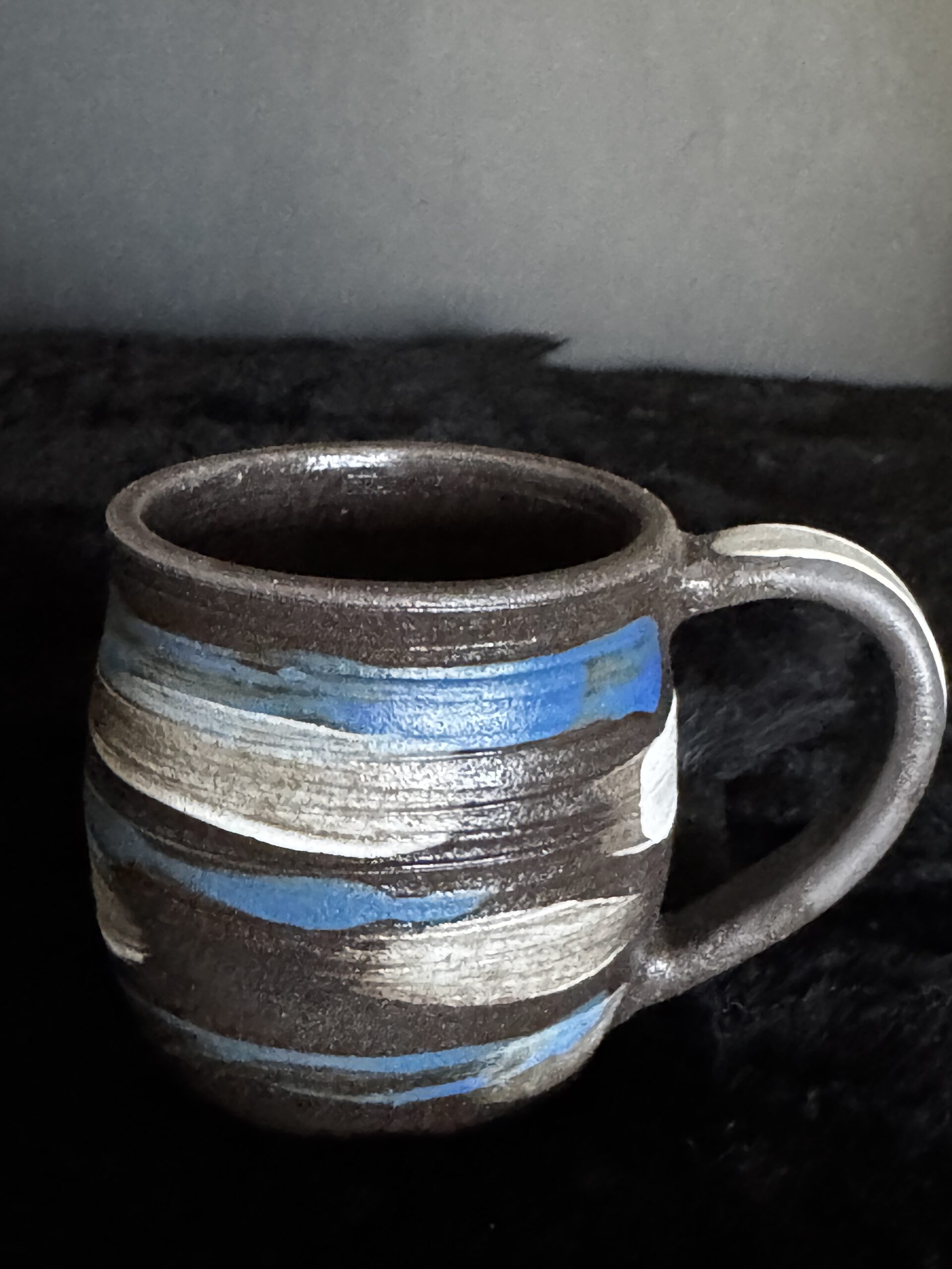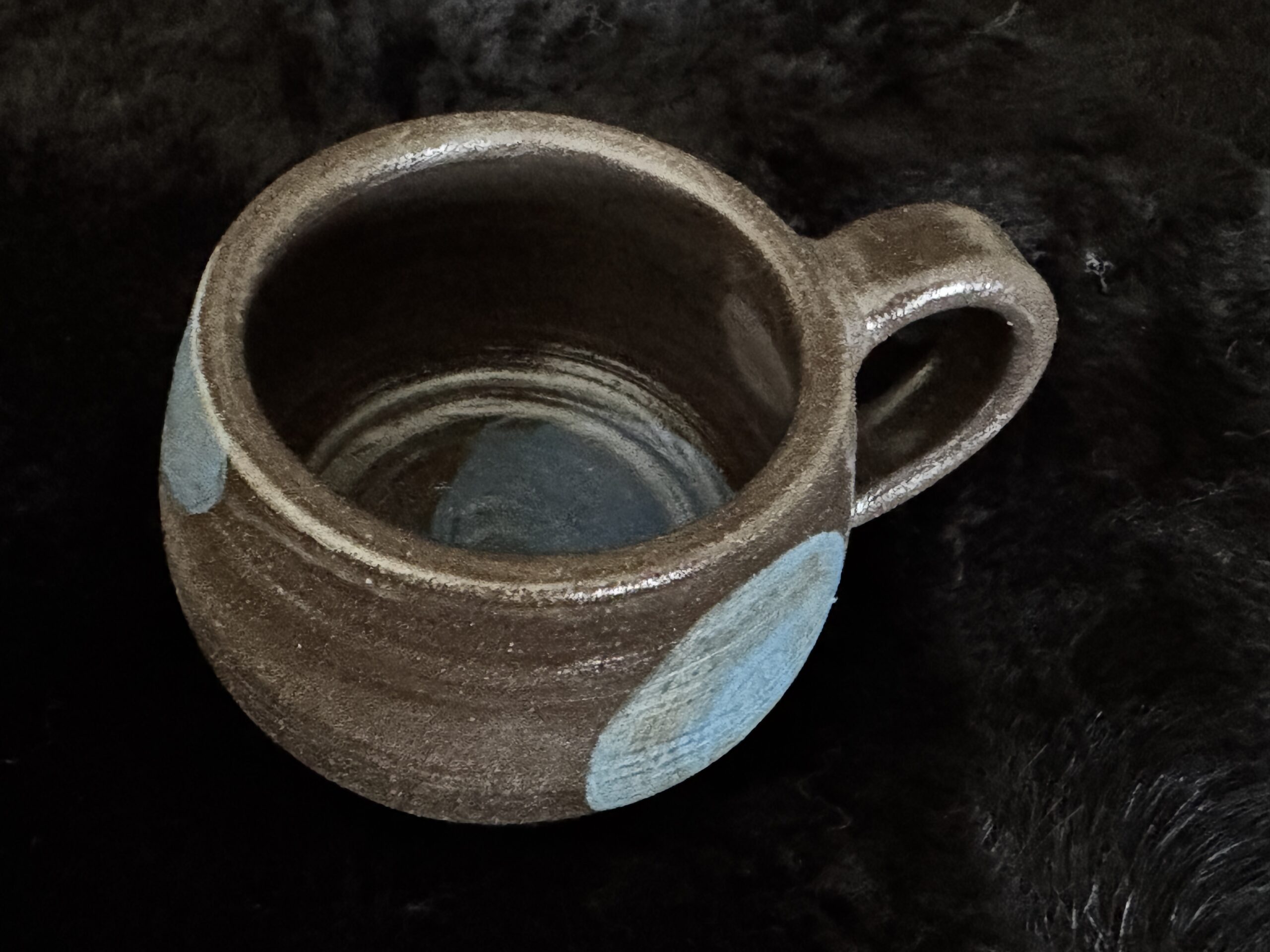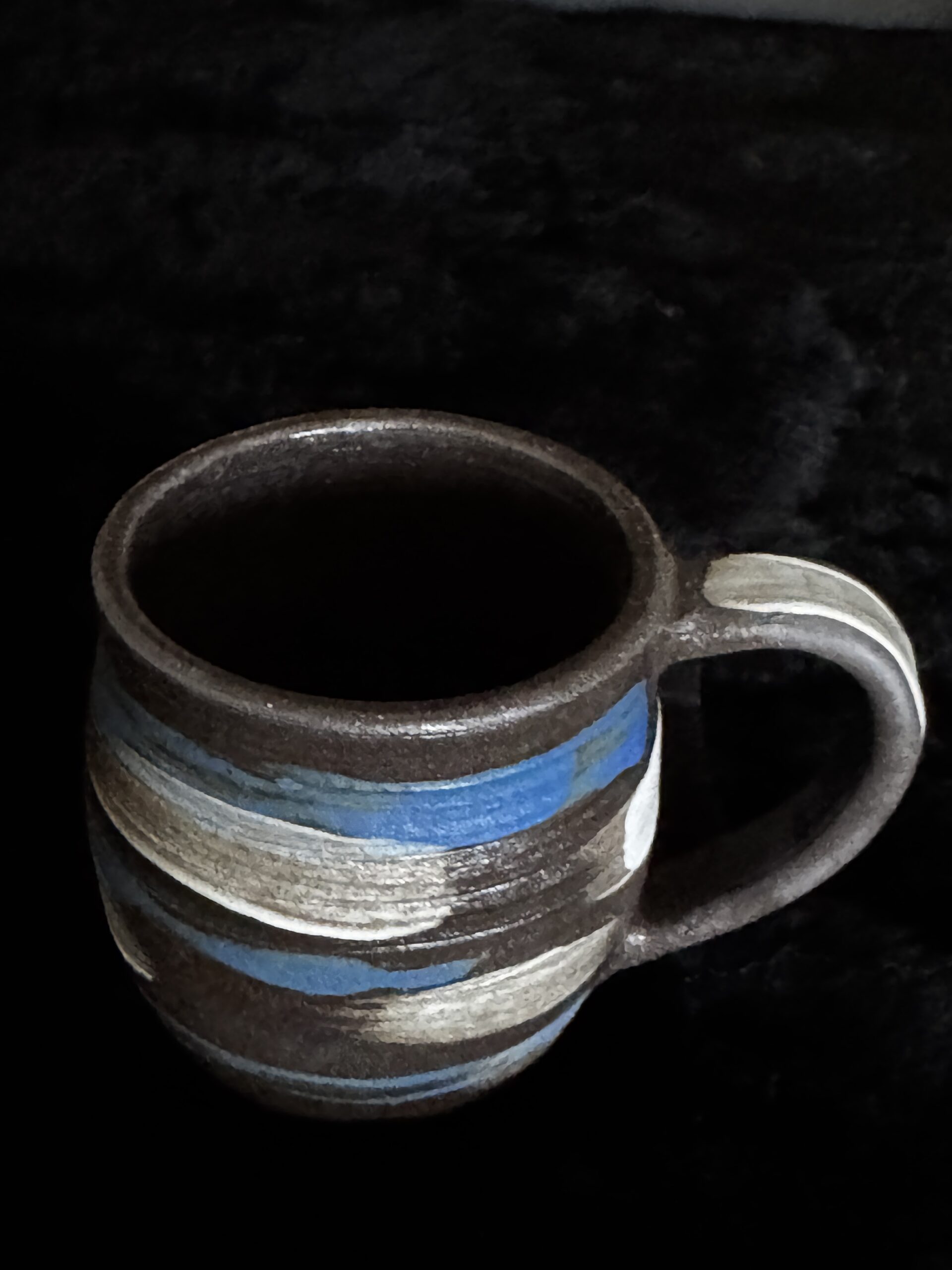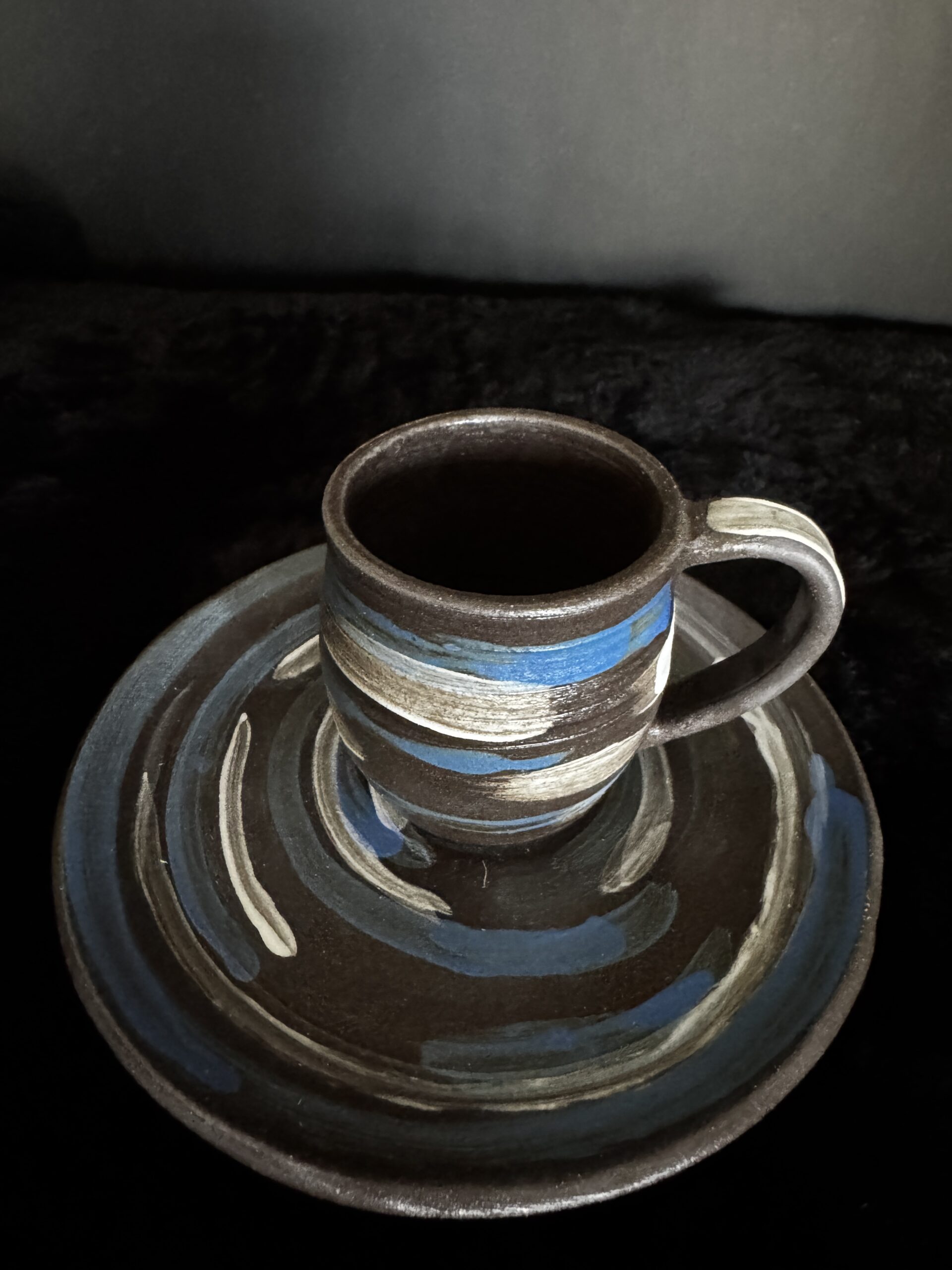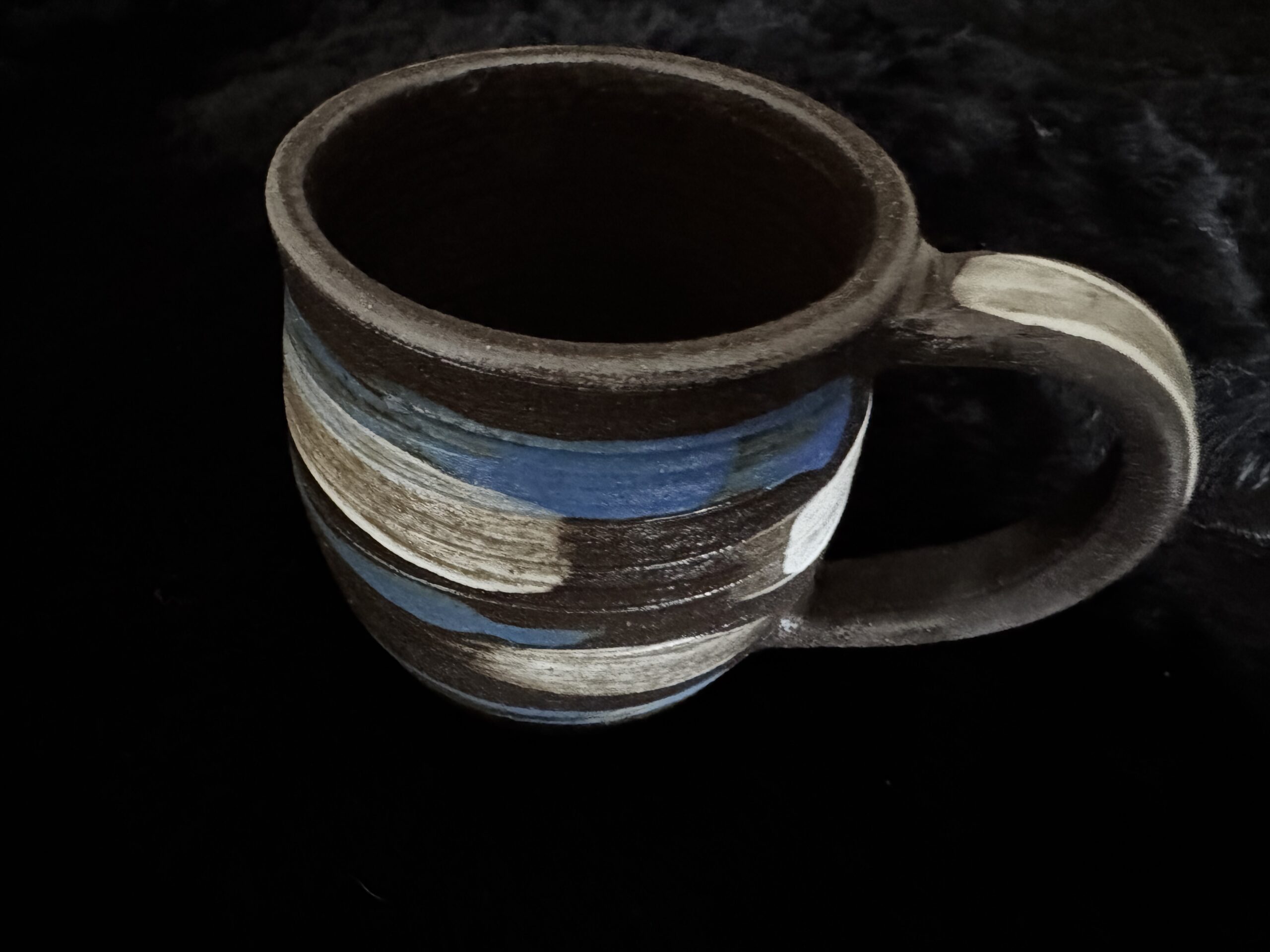 Kruus kuuma joogi nautimiseks, potikedral treitud, mustast savist, käsitsi maalitud angoobidega, erinevad, 1 mummudega, 1 triibuline, 2 seest sinakat Suurus: u 200-230ml Toidusõbralik