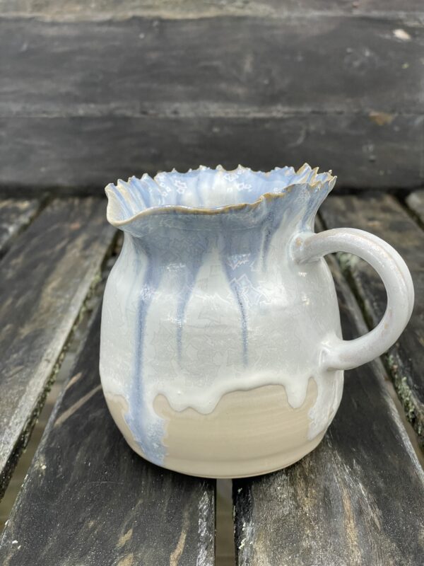 Käsitööna valminud keraamiline ‘kiiksuga’ kannuke, sobiks nii lillevaasiks kui koore/kastme kannuks või hoopiski pliiatsitopsiks glasuur jääkristall, lugano, sees toidusõbralik valge